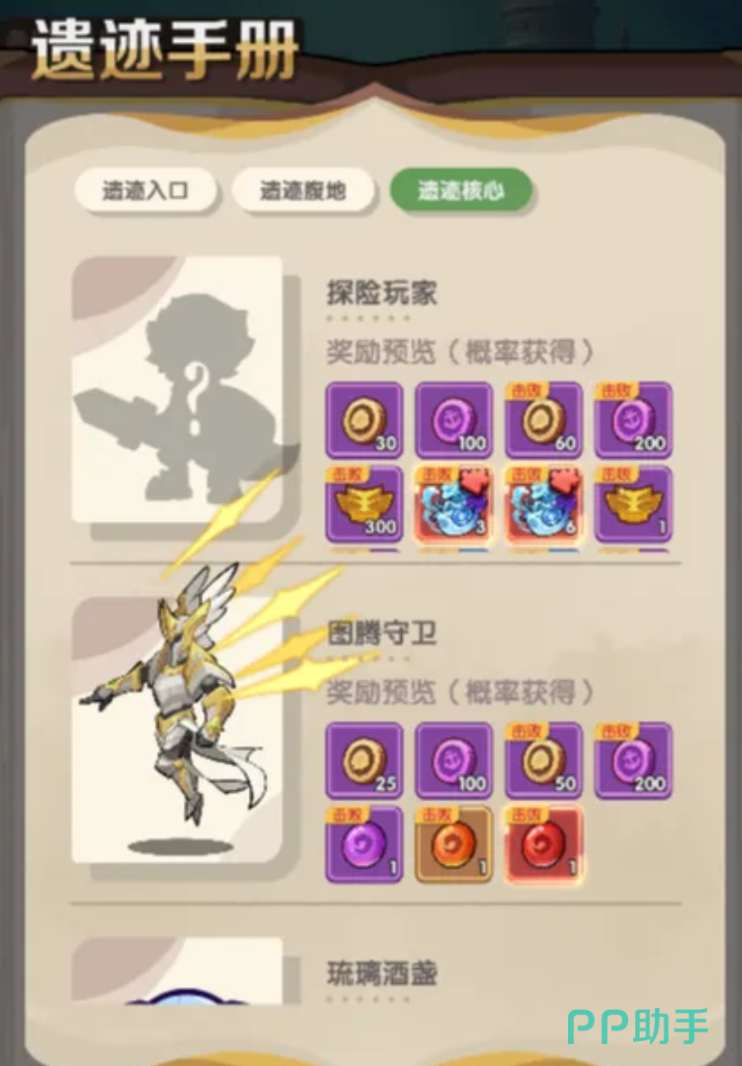 遗迹核心区是强者角斗场,也是最危险也最具有回报的地方。玩家穿过层层阻击到达3层遗迹核心入口的时候就会得到一件非常重要的道具黄金面具,它是领取队伍奖励的物品之一。但是玩家很容易碰到同层的其他强者,就必须和其它强者对抗。胜利给玩家带来丰厚的奖励,但是玩家失败会有一部分概率失去黄金面具、刻印,还会掉落到二层稍作休息。因此,玩家在开始核心战斗之前,必须使刻印属性得到提升,保证战力的输出。