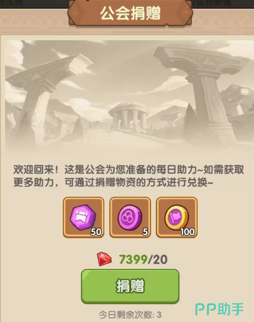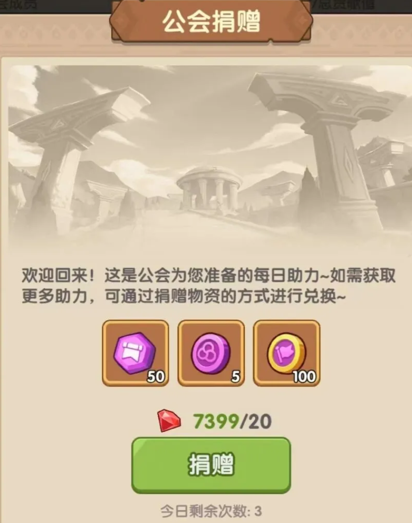 加入公会后,玩家们的第一件事就需要去公会大厅做每日的捐赠。这是提高公会实力的基础,也是个人收益的主要来源。每天来这里贡献一下,用捐赠的钻石可以同时获得公会经验、公会活跃度、公会币。这一举三得的操作绝对是血赚不亏的,公会经验可以提高公会等级,解锁更多的高级功能,公会活跃度关系到全员宝箱的解锁,公会币是公会内部流通的硬通货。玩家们需要记住:一个活跃的公会如果没有玩家的每天坚持,是不可能成功的,玩家每次的捐赠都是一份集体的荣誉。