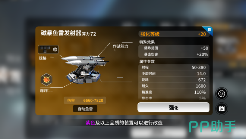 自动武器里【磁暴鱼雷发射器】(高能鱼雷发射器)就是鱼雷类武器的强度标准。鱼雷是带有AOE伤害的一种爆炸类武器,基本伤害值比其他的兵器高很多,小范围爆破会使得重叠区域内的敌人生命值被降至一半或者直接死亡。磁暴鱼雷之所以能脱颖而出,是因为它在经过三次改造后获得的技能是暴击伤害加20%。只要玩家的战舰暴击率足够高,它爆发的伤害就会大于大部分鱼雷,是清场的利器。但是玩家需要注意的是,鱼雷射程短、容易被拦截,使用时要配合其他武器进行掩护。