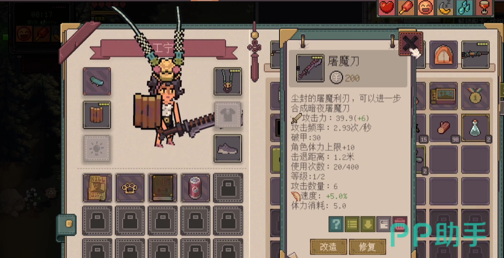 屠魔刀是一把价值200金币的近战武器,这把武器的攻击力高达39.9,这个攻击力在近战武器中可以说是比较高的存在了,而且武器的攻击频率也非常的快,每秒钟可以攻击2.93次,能够带来30点的破甲值,在装备上屠魔刀以后,角色的体力上限还会增加10点,击退距离为1.2迷,使用400次以后需要玩家进行维修,每使用一次屠魔刀以后会消耗掉玩家5点的体力值,移动速度会增加5%,攻击数量为6,从屠魔刀的各方面属性,不难发现这把武器真实的非常不错,最重要的是屠魔刀能够合成暗夜屠魔刀。