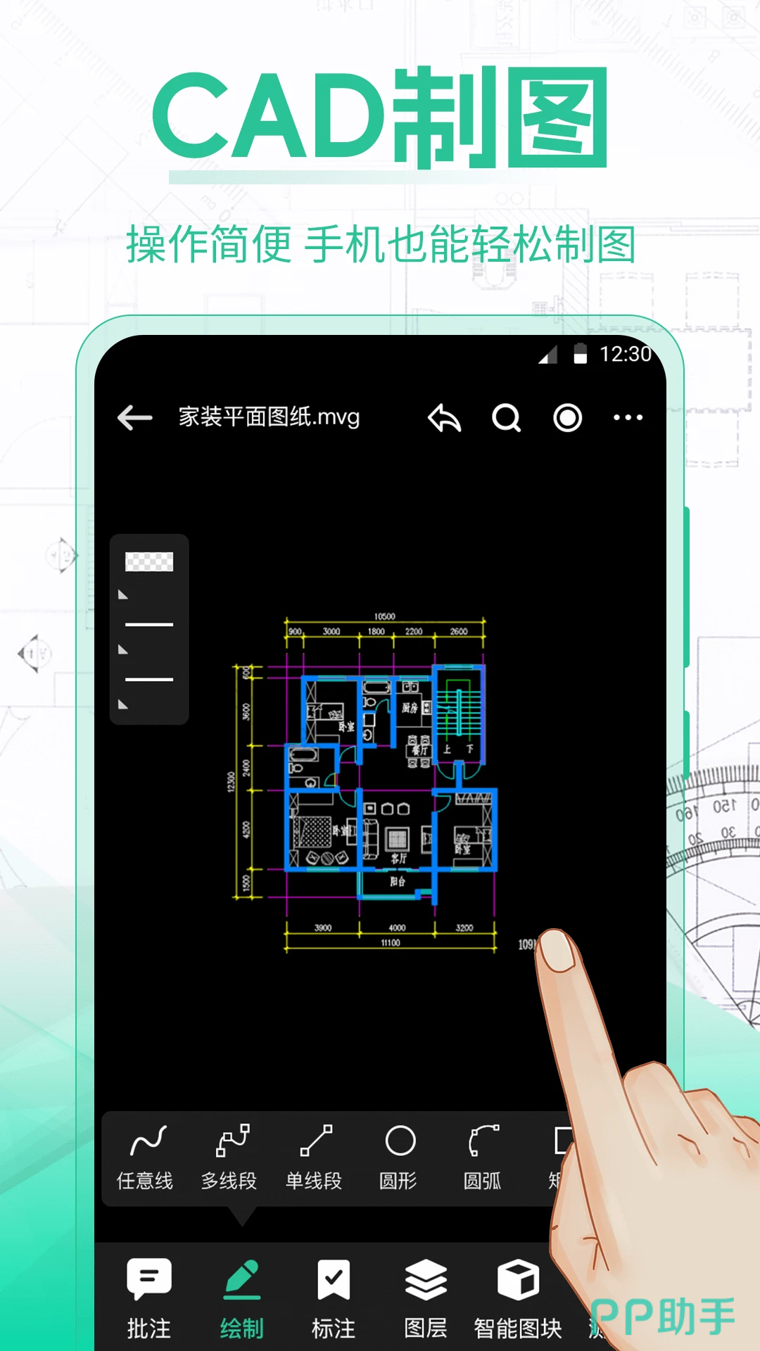 支持查看CAD的完整图纸,可以自由移动加标注,下方还有分明的图层管理。可以对已有草图进行绘制生成,提供测量工具,可以实时的测距离和面积,很适合用于工地建筑和装修家具等,绘制好的图片可以快速轻松分享导出PDF版本。