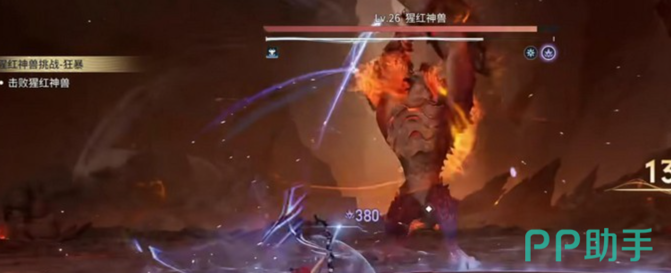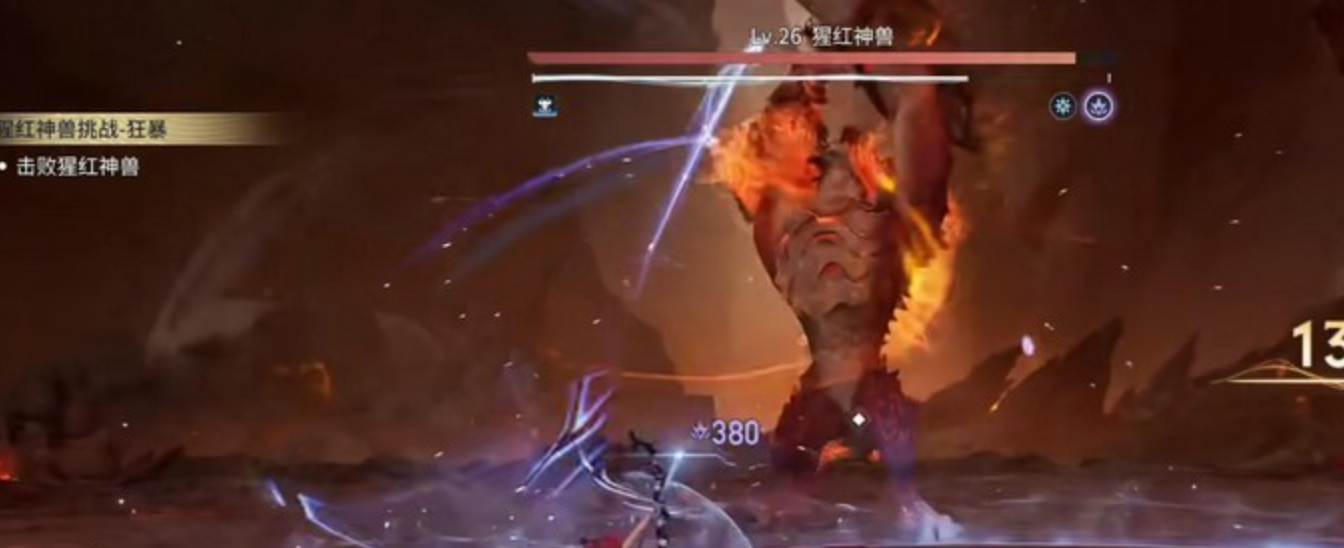 对于猩红神兽的技能要格外注意它的红光攻击和大招陨石。红光通过闪避强化普攻可以破防,用晕眩和昭君蓄力技打出昏厥击破,手臂是弱点,锁定部位输出可以获得额外伤害。boss飞天释放陨石的时候,玩家可以左右跑动、极限闪避来规避伤害,也可以用场地石柱做安全躲避。技巧运用到位,再加技能合理的释放,在最短的时间内完成战斗,就能得到限定称号。