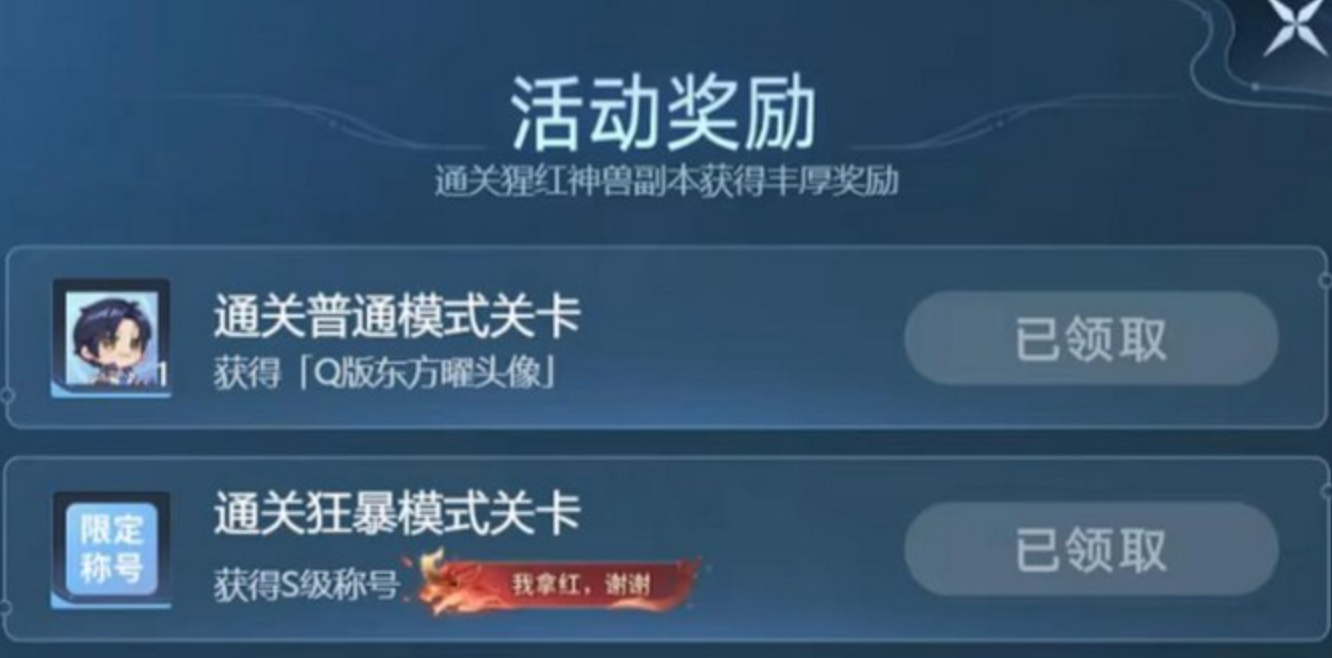 本次活动以东方曜的梦境为内容,是趣味性与挑战性并存的活动。当玩家完成通向普攻的模式后,即可获得Q版东方曜头像,挑战狂暴模式之后就可以领取到限定称号“我拿红,谢谢”了。除此之外,玩家公布自己获得的战果会获得20颗晶珀,有利于后面资源的获取。活动设计既给低能力者提供轻松获得奖励的途径,也给高手们留下了挑战性的难题,使每个玩家都可以找到属于自己的乐趣点。