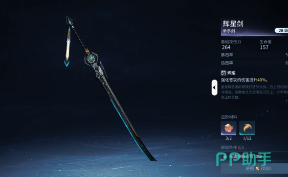 辉星剑这就是第二个要为大家分享的武器。这把武器强度还有颜值都是很不错的,属性上面也会全面的升级。16级就会拥有264的基础攻击力,生命值,暴击率,还有追击力就会全面的提升。辉煌特效就会直接翻倍,强化普通攻击伤害还会提升40%,这就等同于给输出开了一个大挂。而且这把剑的背景故事也是比较戳人的,完美对应了整个成长。