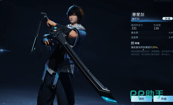就应该先来了解一下寒星剑,这完全就是一个入门的标配。从外观来看,走的就是简约科技风,黑蓝配色的表面还会透着冷光,一看就不是凡铁所打造。属性上会比较贴合新手,26级就能够拿到基础性的攻击力,并且还会有4.6%的暴击率,还有5.4%的追击率,最关键的是还有一个辉煌特效。直接就能够强化普通攻击伤害提升到20%,让你在刚刚上手时就能够打出流畅的连招,根本就不需要担心伤害不够。