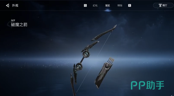 破魔之箭这就是伽罗的专属武器,作为游戏里面的射手代表性武器。这把武器的力量感,还有外观是比较不错的。黑银的配色虽然看上去很低调,但是真的很霸气,一看就是一把神器。作为伽罗的专属武器,就可以适应射手的输出机制,无论是爆发输出还是远程消耗,都可以给伽罗带来超强的属性加成。