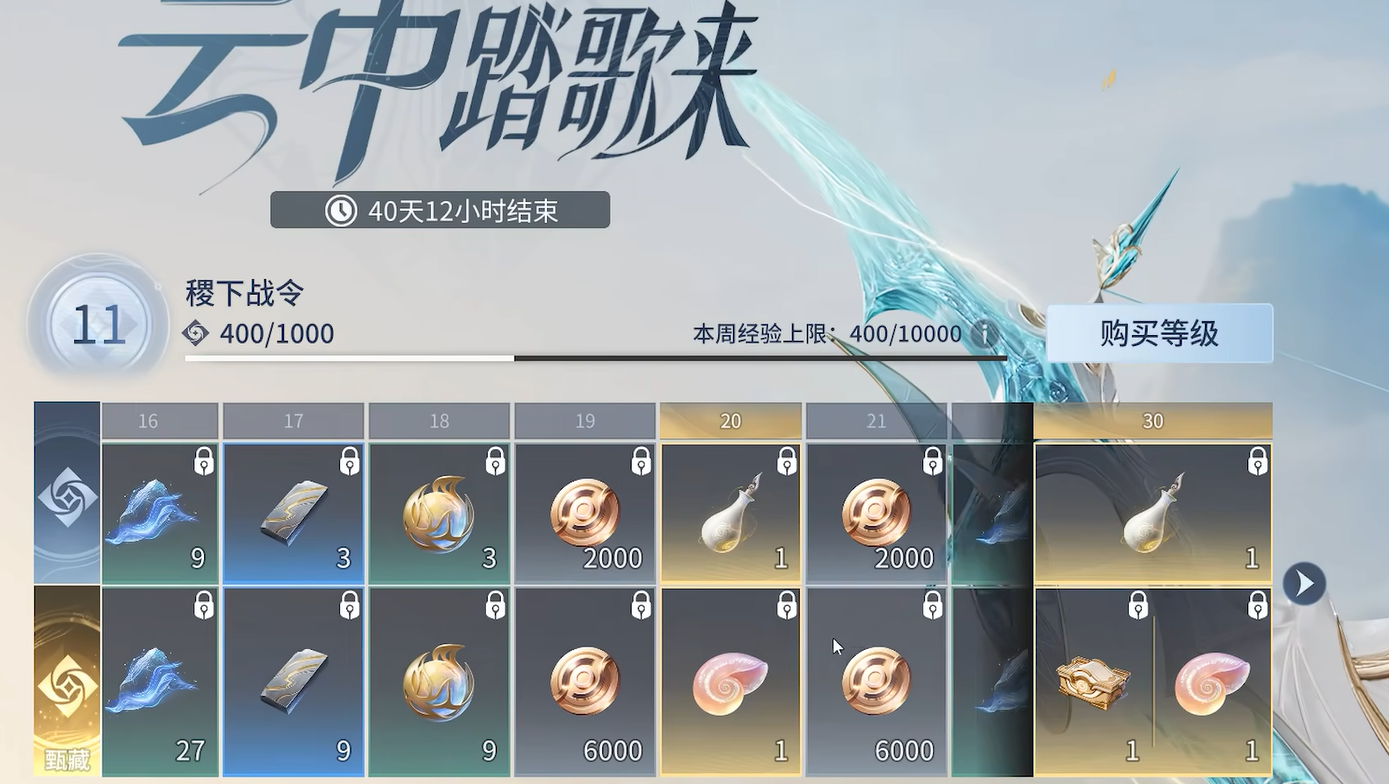战令升级奖励这块,基础版本每级都有养成资源,买了战令之后,每级额外获得三倍的量,部分等级的资源,还会换成蚀露魔瓶,用了之后,可以在最高等级的装备副本里,拿到双倍收益。这批资源不只是够把伽罗养起来,多出来的部分,还能给其他角色补一补。每升十级,会额外给一发晶珀池的抽奖道具,30级和40级各有一个自选礼盒,50级还能拿到伽罗的武器外观。五发晶珀池折算下来,大概相当于750晶珀,从数值上看,干满50级确实是赚的,但前提是你本来就有抽幻化的打算,对于普通玩家来说,性价比就没那么高了。