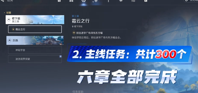 第一个自然就是活动类的奖励,这就是初期最容易获取的福利。全部做完之后就可以拿到2050个。赛季开始之后同步上线各类的限时活动,新手福利,每天只需要花几分钟就可以完成简单的任务。就能够稳稳的拿下这一部分的资源,不需要浪费太多的时间,这就是一个白给的福利。这就是主线任务,游戏目前开放到6个主线,在全部通关完成之后可以拿到300个。主线任务不仅可以解锁游戏的剧情,还可以顺带拿资源。