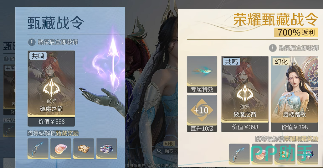 当前战令体系划分为两个档位:售价68点券的高级战令,以及售价168点券的升级战令。二者均可解锁伽罗英雄及专属皮肤,但皮肤表现存在显著差异——高级战令提供基础款皮肤,具备常规特效;升级战令则额外附赠一款幻化皮肤,拥有更丰富的动态光效、粒子细节与动作演绎。此外,升级战令开通即自动提升至10级,可立即领取幻化皮肤相关特效组件,而高级战令需通过任务逐步升至对应等级后方可激活。其余奖励内容(如铭文碎片、英雄碎片、荣耀积分等)在两档战令中基本一致。对于偏好实用型收益、对幻化特效需求较低的玩家,68元档位更具投入产出比。