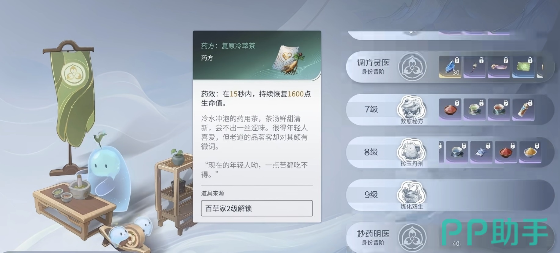 百草家职业通过主线剧情自然解锁:完成指定章节后,系统将自动引导至城镇内百草堂NPC处完成入门仪式。制药能力随等级提升逐步开放,初始仅支持基础回血药剂(如清露丸),后续可研习高级配方,包括瞬回类(如九转还魂散)、减伤类(如金缕护心膏)等战术型药品。每成功炼制一次药品均可获得经验,累计升级后解锁新配方槽位与炼制效率加成。