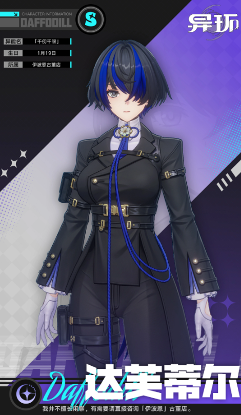 达芙蒂尔为暗属性双持近战角色,普攻为五段暗属性异能伤害;长按普攻将向前位移突进,发动旋风急斩并留下持续伤害印痕。“同振”技能对单体目标造成暗属性输出,当全队角色释放援护技时,该技能可叠加层数,每层提升伤害与“倾陷值”;叠满两层后技能形态升级,转为绳索缠绕+太刀斩击,造成更高额暗属性伤害。“交刃”为单次中距离暗属性斩击。“见此终幕”释放范围暗属性异能伤害,随后解放左眼,进入强化状态:自身造成的全部伤害提升,并对范围内所有敌人施加“洞察”效果,使其受到的暗属性伤害提高。