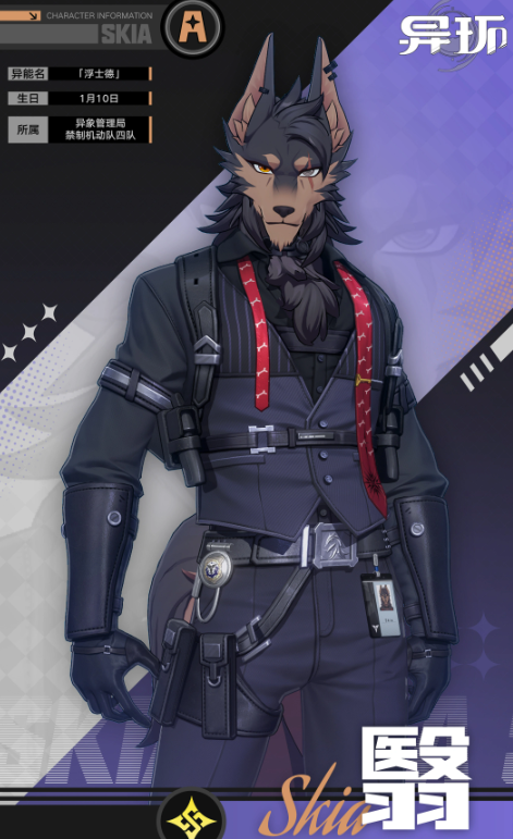 翳为狼首造型的相属性高机动近战角色,核心机制围绕“影子”与“兽牙影刺”展开。普攻五段格斗连击,每次命中敌人都会从本体影子中分裂一枚“兽牙影刺”进行追踪打击。“潜影追踪”技能令其瞬移至自身影子所在位置,造成六段范围相属性异能伤害;本轮伤害命中的每个目标均会触发三枚影刺协同追击,并使翳进入“潜影状态”——该状态下可在地面或垂直墙面自由移动,且不会被敌人侦测;同时具备部分伤害免疫特性;当主动接触被影刺标记的目标时,将额外触发一次影刺协同攻击。“缉令”以警犬指令形式发动,驱使影子撕咬指定区域,造成范围相属性输出;终结技投掷旋转打火机,引发影子向四周扩散造成首次范围相伤,随后多重黑影集中奔袭目标区域,连续触发三次范围相属性伤害;技能释放后,所有“兽牙影刺”的基础伤害提升,并对范围内敌人施加控制效果。