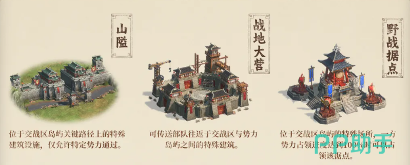 交战区内设有战地大营——一种具备双向传送功能的特殊城池。玩家可通过战地大营,将本方势力岛屿上的部队快速投送至交战区,亦可将已部署在交战区的部队撤回后方休整。每座交战区岛屿上均布设3座战地大营,构成兵力调度的核心枢纽。