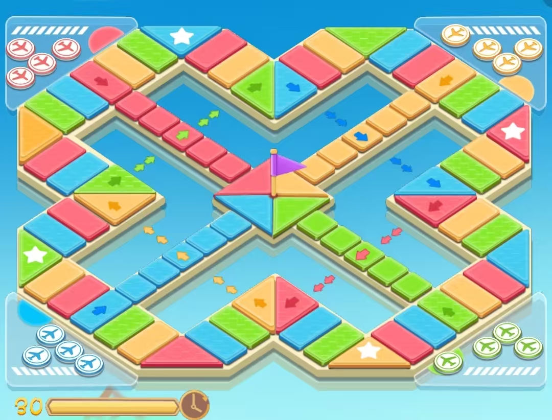 飞行棋脱胎于传统桌面棋类,核心机制依赖骰子点数驱动行进。本作支持四人实时匹配,每位玩家操控四架飞机,须掷出特定点数方可起飞。系统内置超时自动投骰机制,保障对局流畅性;最终以首位完成全部飞机抵达终点者为胜。规则清晰、节奏明快,兼具社交性与随机趣味。