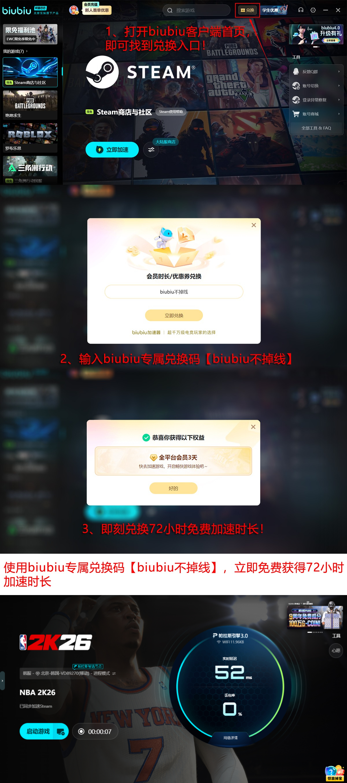 新用户注册后即可立即启用完整功能,享受连续24小时无限制加速服务;完成指定引导步骤并输入激活码【biubiu不掉线】,还可额外领取72小时专属加速权益。两项福利叠加,总计可获得96小时高质量网络加速体验,充分覆盖新手适应期、赛季冲分阶段及关键排位赛周期,助力玩家在NBA2K26虚拟赛场中稳定发挥全部竞技水平。