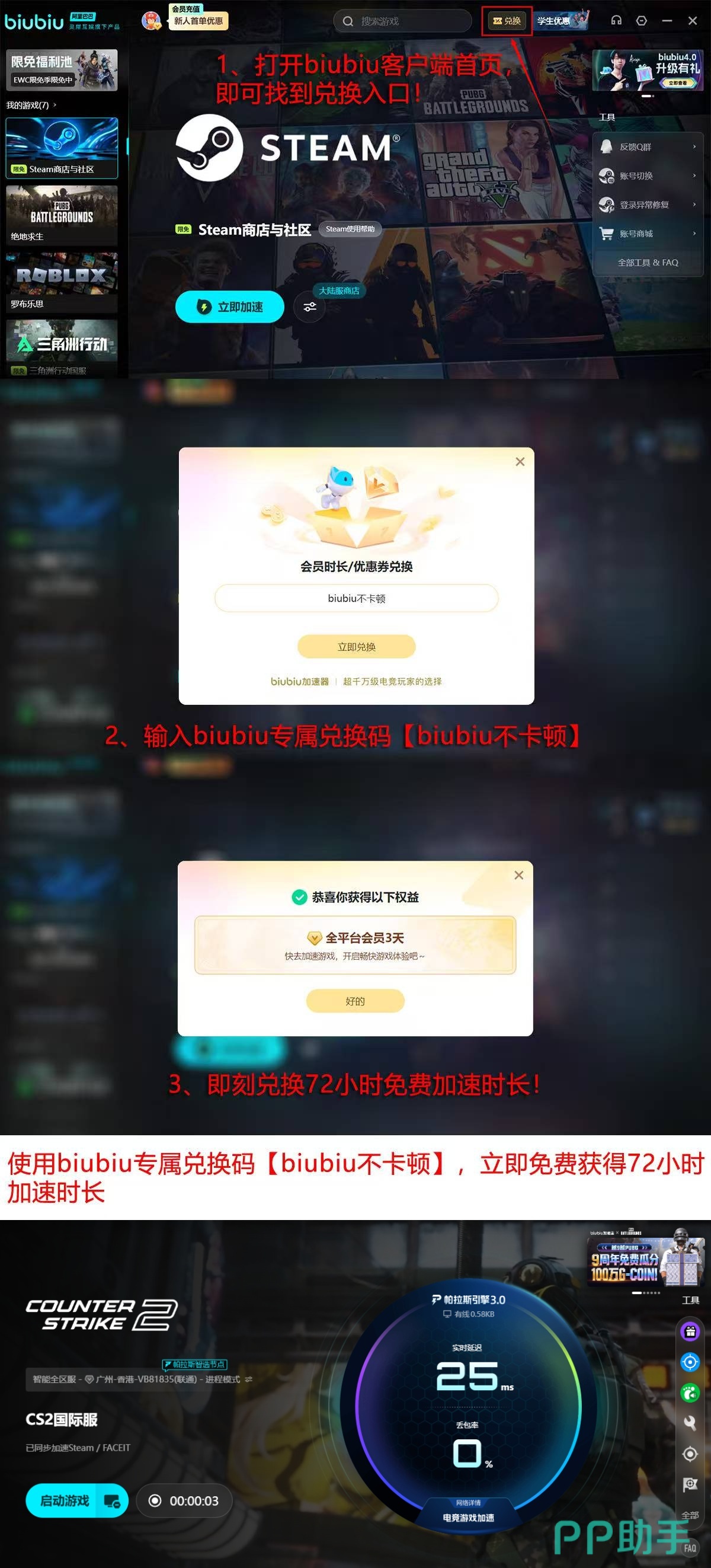 当前新用户完成注册登录,即可领取24小时免费加速时长;输入专属兑换码【biubiu不卡顿】,新老用户均可额外获得72小时加速权益。叠加后新用户总计可享96小时无门槛体验,全程零费用验证加速效果。