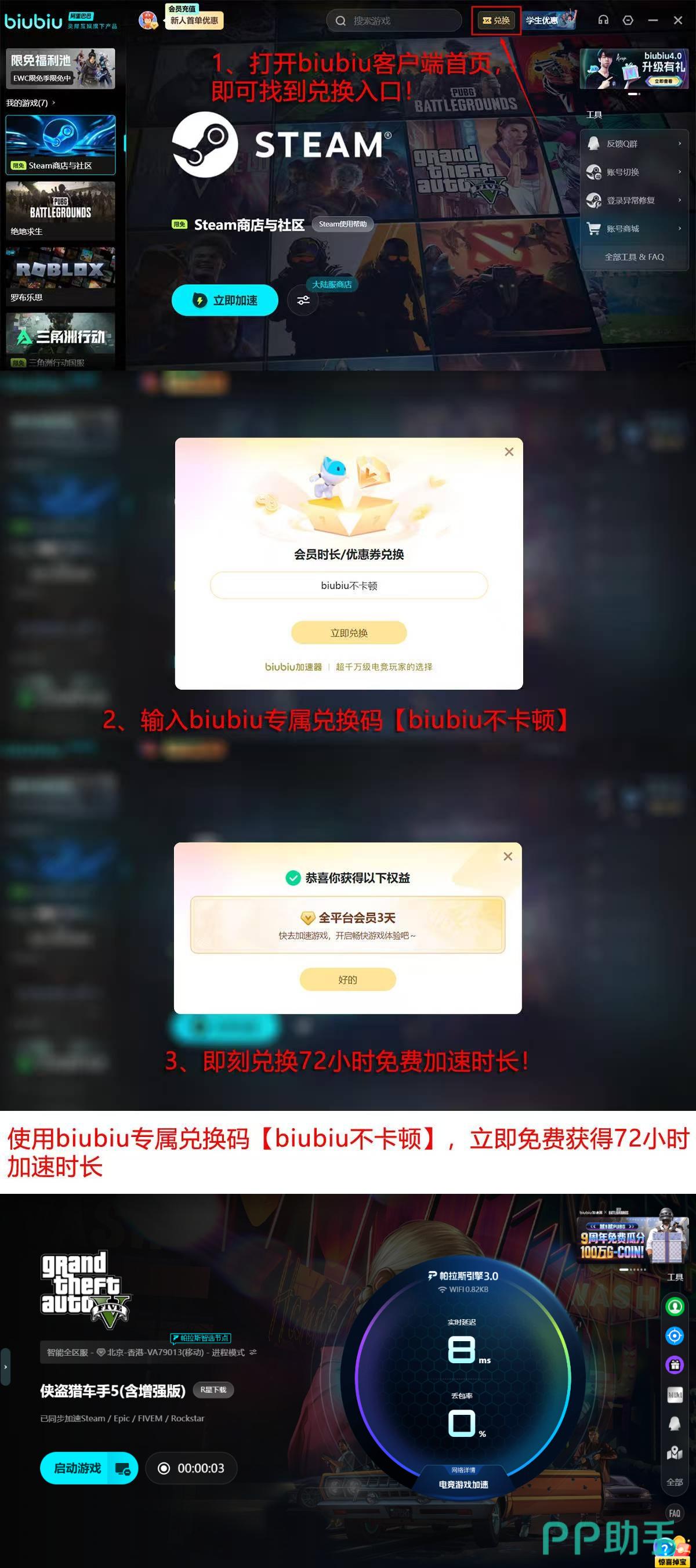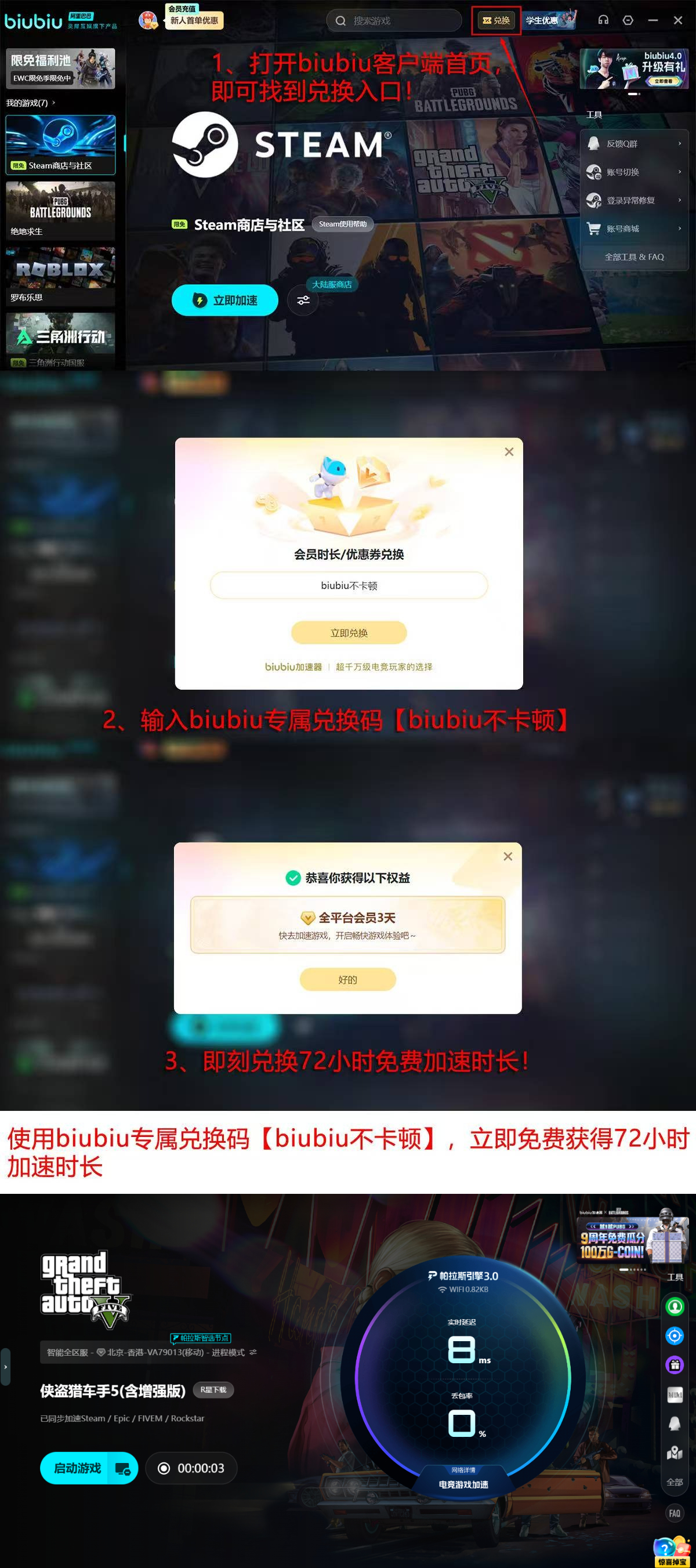 新用户完成注册后即可激活24小时全功能免费体验权限;额外输入兑换码【biubiu不卡顿】,还可叠加获得72小时加速时长,合计享96小时无限制高品质网络加速服务。