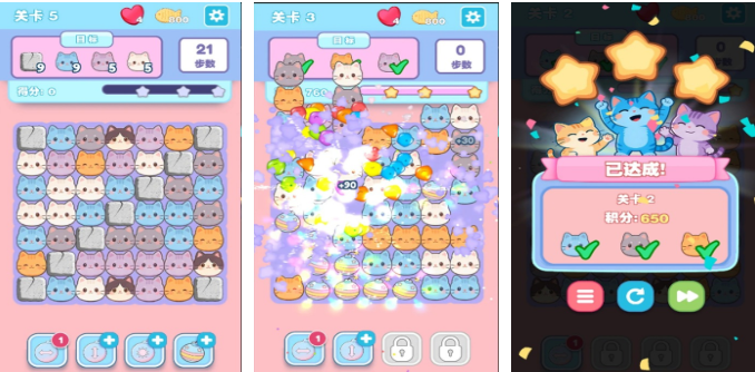 本作聚焦经典消除玩法,所有可消除单位均为动态绘制的小猫头像,支持拖拽交换与连击特效。关卡目标多样化,包括收集指定花色、解救被困猫咪、清理障碍物等;内置四种功能性道具——彩虹球、闪电锤、冰霜瓶与时间沙漏,分别对应范围清除、直线爆破、冻结障碍与延时操作,策略组合空间丰富。节奏明快,操作直观,适配碎片化娱乐场景。