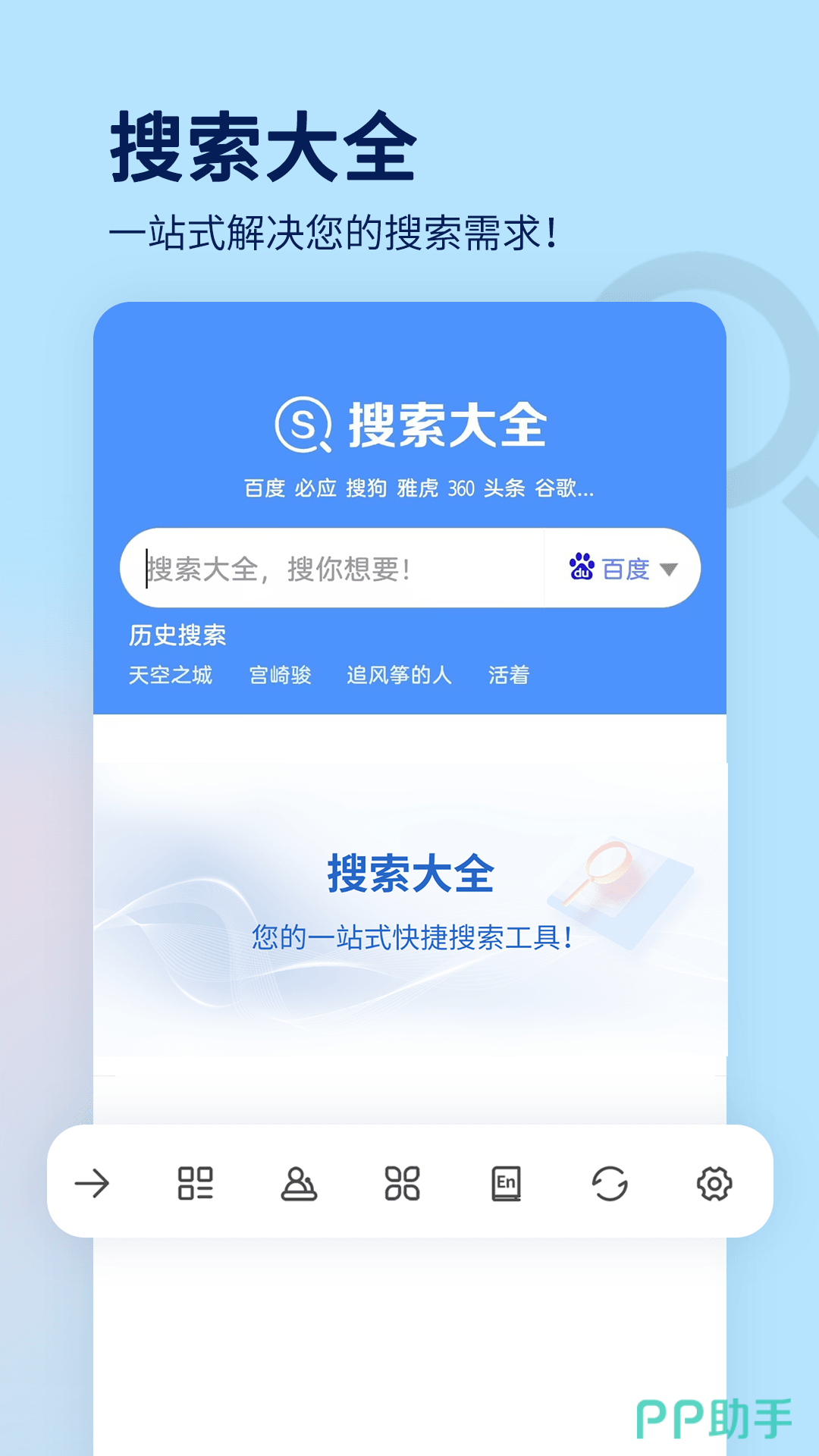 拥有极简界面的搜索大全,融合了目前许多主流的搜索引擎工具,可以在一个搜索引擎上使用全部的功能,其搜索到的内容,经过系统整合之后,能更容易满足大家的要求,而且界面还支持自定义功能设置,是一个使用起来非常方便的搜索工具。