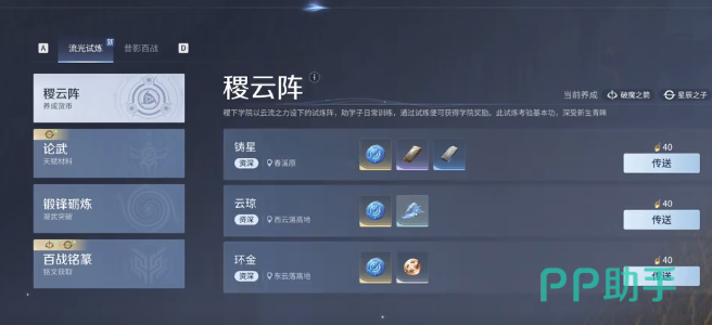 首先玩家就应该选择稷云阵,这里所能获得的货币是可以作用于每一个英雄上。但建议大家在分配体力时就应该放到最后,千万不要选择优先消耗。那在试炼的过程中要说最为重要的就是论武,这就是强化英雄天赋流脉的核心。当然材料并不是按照出战英雄掉落,而是根据目标英雄去定向挑战。目前会分成四大类型,材料和对应的英雄是固定的,玩家所需要做的就是锁定主养材料,然后精准的刷取对应的材料。