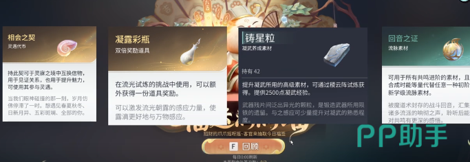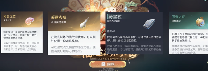 签到奖励覆盖角色成长、装备锻造及资源兑换三大方向。其中,相会之契、凝露彩瓶、铸星粒、回音之证、环金等为本期活动的核心产出。上述材料均为游戏中不可替代的基础硬通货:相会之契用于解锁角色专属剧情与羁绊系统;凝露彩瓶直接作用于角色属性强化,是常规养成链中高频消耗品;铸星粒则为高阶装备打造的关键合成材料;回音之证与环金分别服务于特定副本通关与稀有道具兑换环节。相比其他获取渠道,签到途径显著降低时间成本,具备极高性价比。
