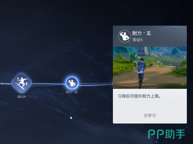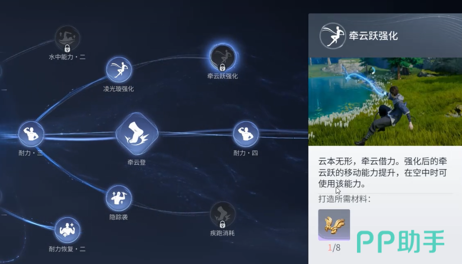分支路径以牵云跃为起点展开。首条分支(下方路径)建议点满,可大幅提升体力恢复速率,有效缓解连续跳跃、攀爬、滑翔带来的续航压力;第二条分支(上方路径)同样推荐点满,重点强化滞空时长与空中姿态控制能力,使跨峡谷、越断崖等复杂地形通行更稳定高效。其余分支可根据个人操作习惯与常用路线特征灵活分配,无强制顺序要求。