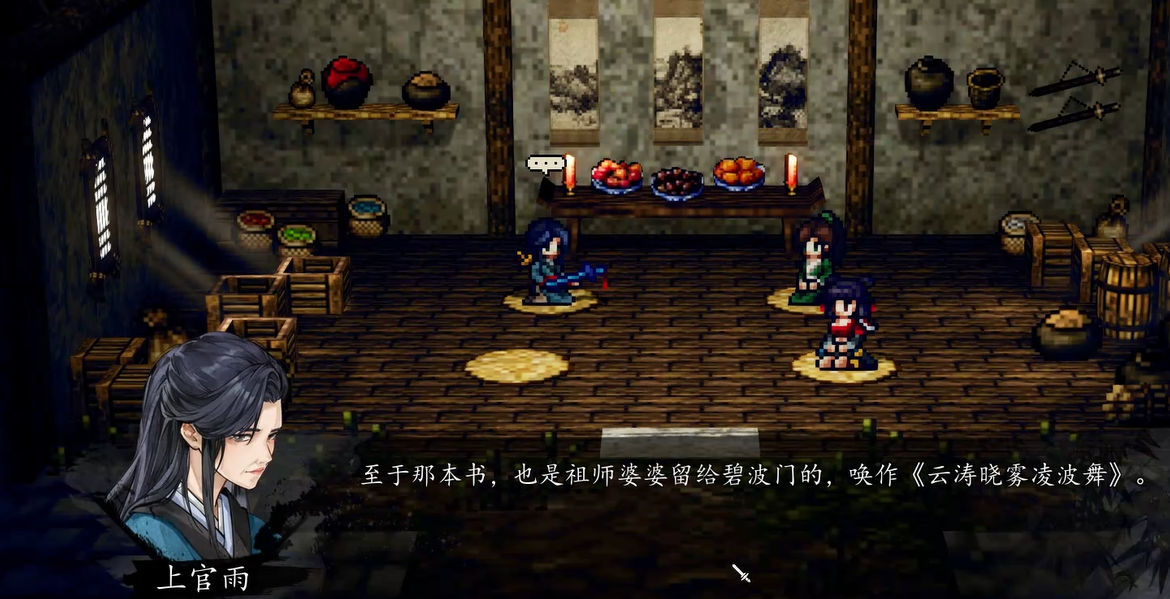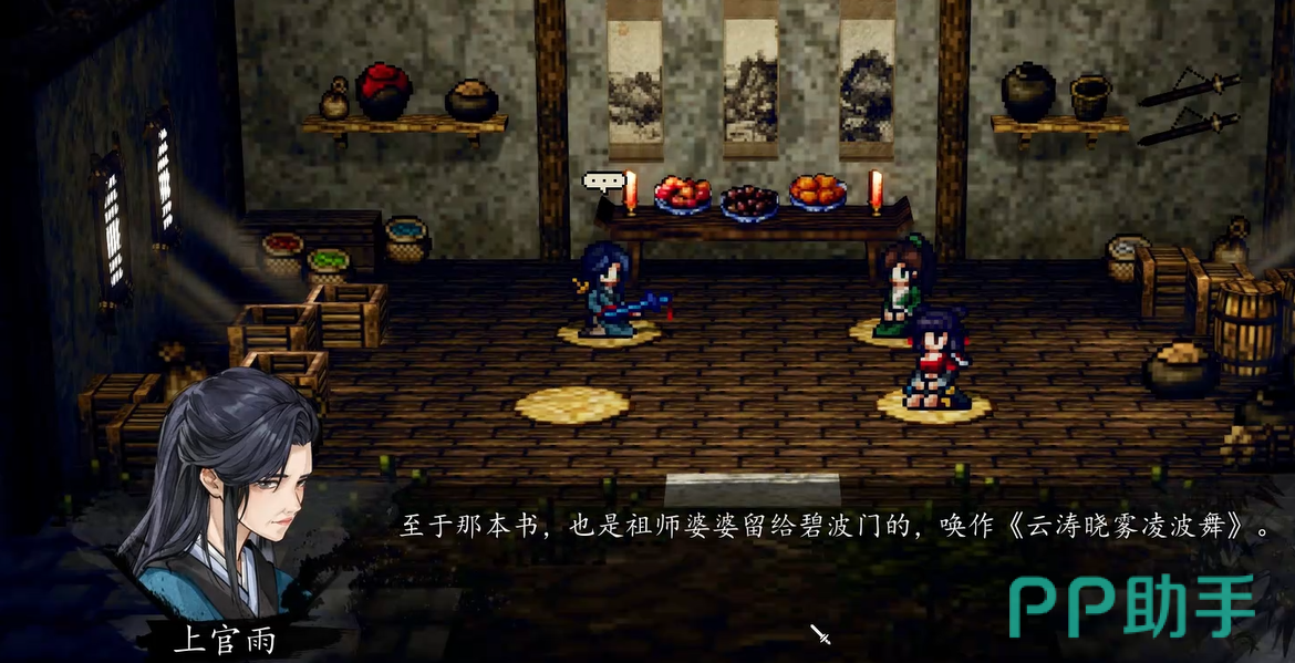 在主线发展到众人前往碧波门之后,宇文逸因为身体受伤,需要在那边静养。这时候会触发一段涤罪僧帮忙疗伤的桥段,主角的气血和真气,都会得到不小的提升。等伤养得差不多了,大家就要准备动身离开。这时候千万不要直接点传送,或者跑出大门。一定要去药房左边的那个房间里,找到上官雨。在这个地方,上官虹和司马铃会重新回到队伍里。就在这个时候,上官雨会给玩家交代一些事情,并送出一份大礼。这份礼物里,除了有上官虹的一把专属武器叫骖龙,剩下的就是大家心心念念的云涛晓雾凌波舞了。