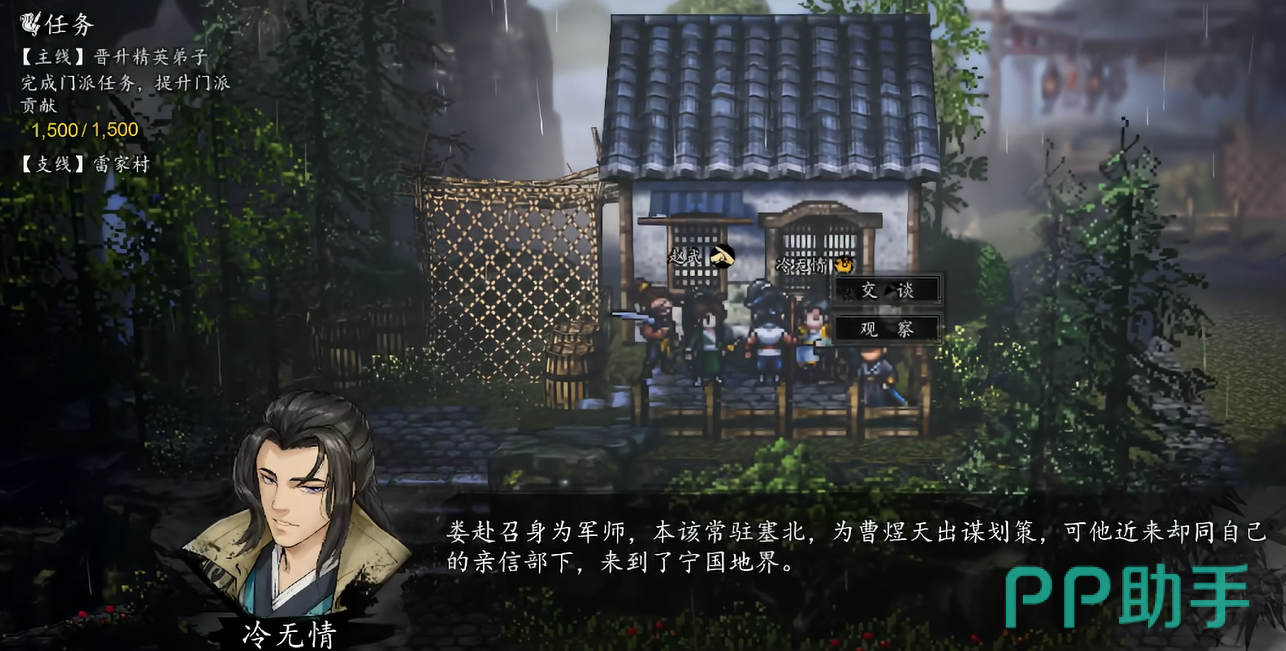 接着就可以往雷家村走了。刚走进去靠近冷无情的时候。会自动播放一段剧情。看完接着去和他讲话。选择前来帮忙的那个选项。然后去找旁边的张文和赵武。跟他们聊聊能知道更多的背景情况。这时候先不忙着出去。要在村子里到处转转。和所有的村民都讲一次话。尽量一个人都不要漏掉。讲完之后再回去找冷无情报告。任务就会更新提示要去连鼓山。这时候冷无情会暂时加进队伍里。趁着他进队了。如果之前没找张文和赵武切磋过。记得现在找他们切磋一下拿点有用的物件。