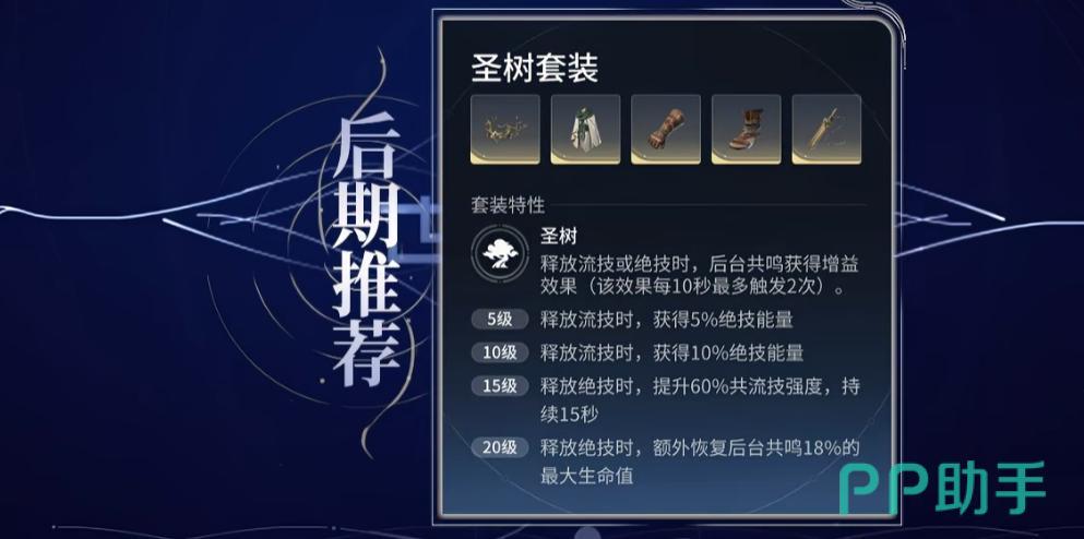 前期推荐使用“魅影套”过渡,侧重提升治疗强度与大招充能效率;后期可更换为“圣树套”,该套装在释放大招时,可使后台共鸣角色获得额外绝技能量与生命值增益,与孙膑的技能循环高度契合。