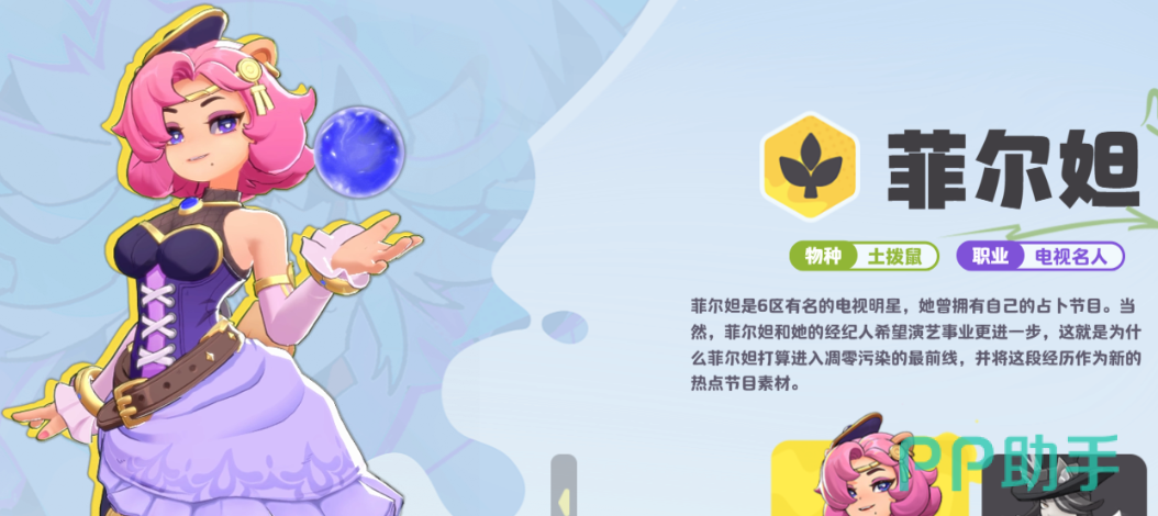 根据官方角色档案设定,菲儿坦原职为一线新闻从业者,任职于某主流电视台新闻部。其外观设计融合拟态化动物特征,以土拨鼠为原型进行艺术重构:体型轻盈、动作敏捷,整体视觉风格兼具亲和力与辨识度。角色随身携带一枚悬浮水晶球,呼应其“占卜师”背景设定,亦成为其技能动效的重要视觉元素。