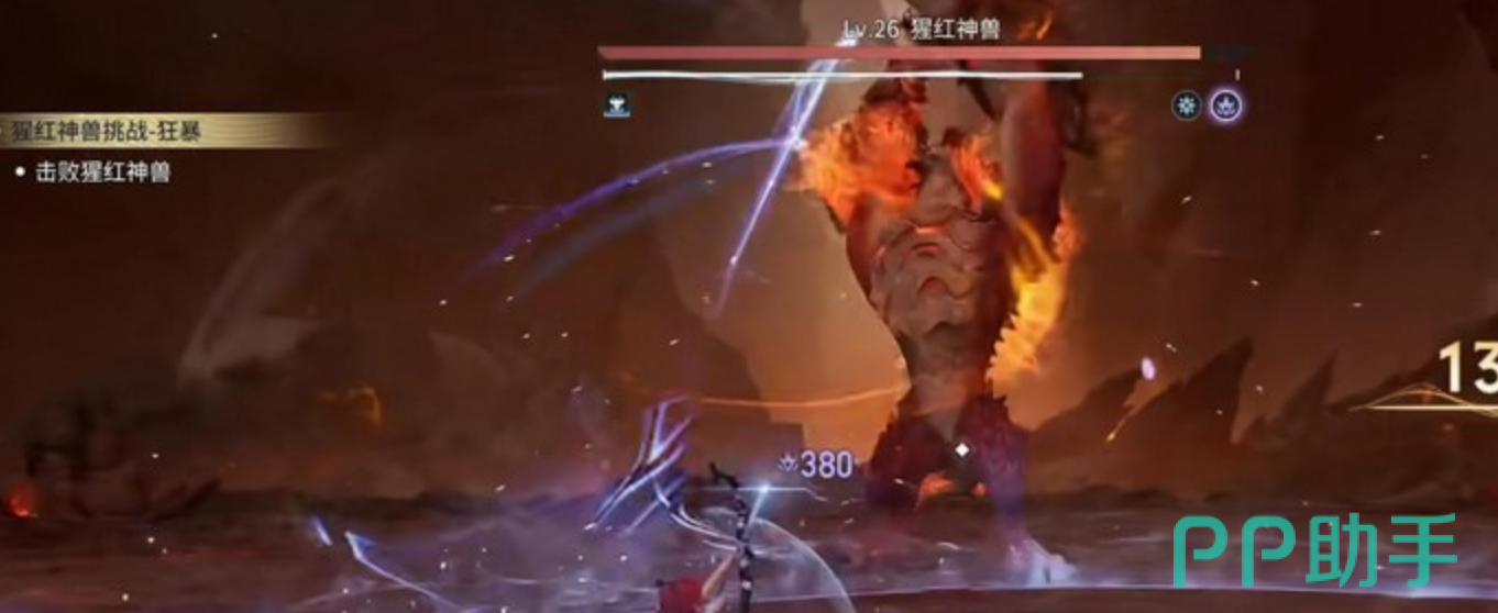 战斗过程中需重点关注猩红神兽的行为模式。其双臂为关键弱点区域,集中火力攻击可触发额外伤害加成。当BOSS进入腾空阶段并召唤陨石时,务必预判落点,执行精准闪避——避免陨石撞击场景中央立柱,否则将引发连锁爆炸。同时可借助场地内石柱作为掩体,规避其大招“猩红天坠”的全屏打击,在保命前提下维持稳定输出节奏。