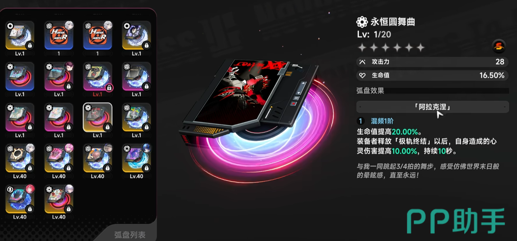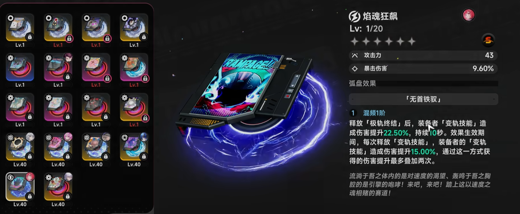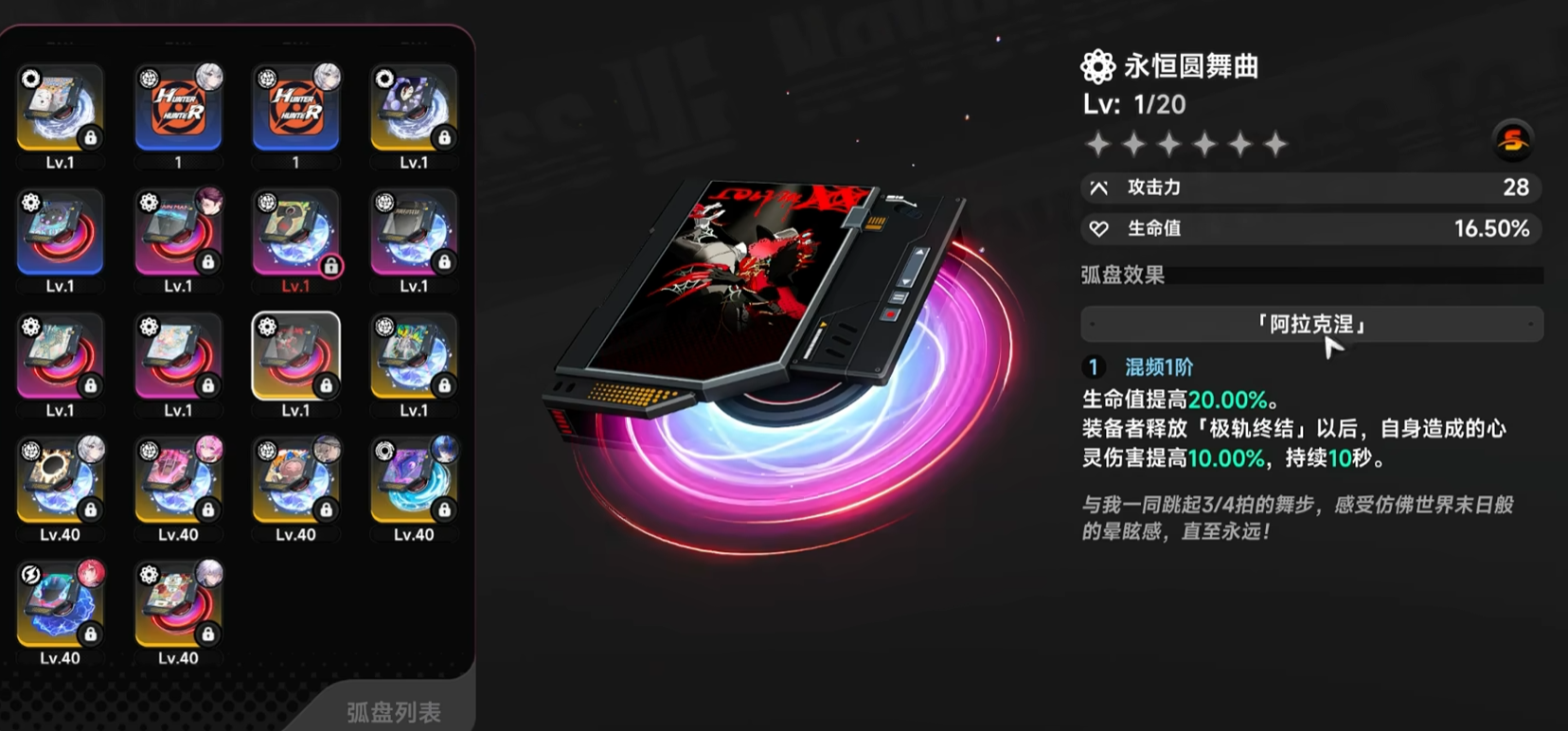 永恒圆舞曲弧盘侧重生存韧性与终结技续航,适用于武将类持续输出角色。其效果为:每次施放“极轨终结”时,角色自身“内心受伤”状态增加10%,但该状态在10秒内不生效。该设计在保障角色存活性的同时,强化了终结技驱动流派的稳定性与容错空间。焰魂狂飙弧盘则是纯爆发向毕业选择,装备者完成“极轨终结”后,“变轨技能”释放频率由每秒3次提升至每秒4次,且每次释放均可使本次技能伤害提高25%,总计叠加提升达10%。