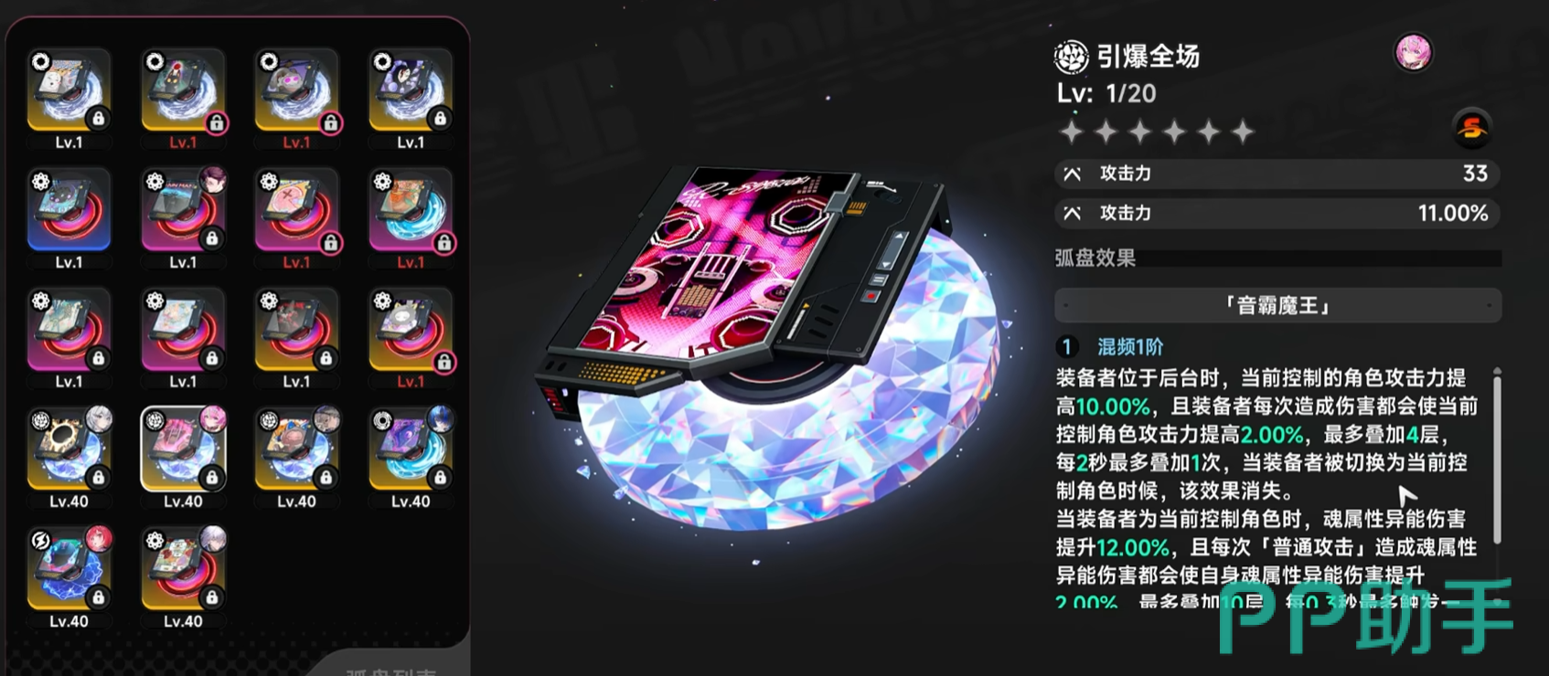 引爆全场弧盘服务于多角色轮换体系,强调后台资源管理。当装备者处于非操控状态时,当前前台角色即获得10%攻击力加成;每次前台角色造成伤害,该加成再提升2%,最多叠加4次。此机制鼓励玩家主动切换角色以激活并延续增益,形成“后台蓄能—前台倾泻”的战术循环,特别适配技能链紧密、能量调度要求高的队伍构成。