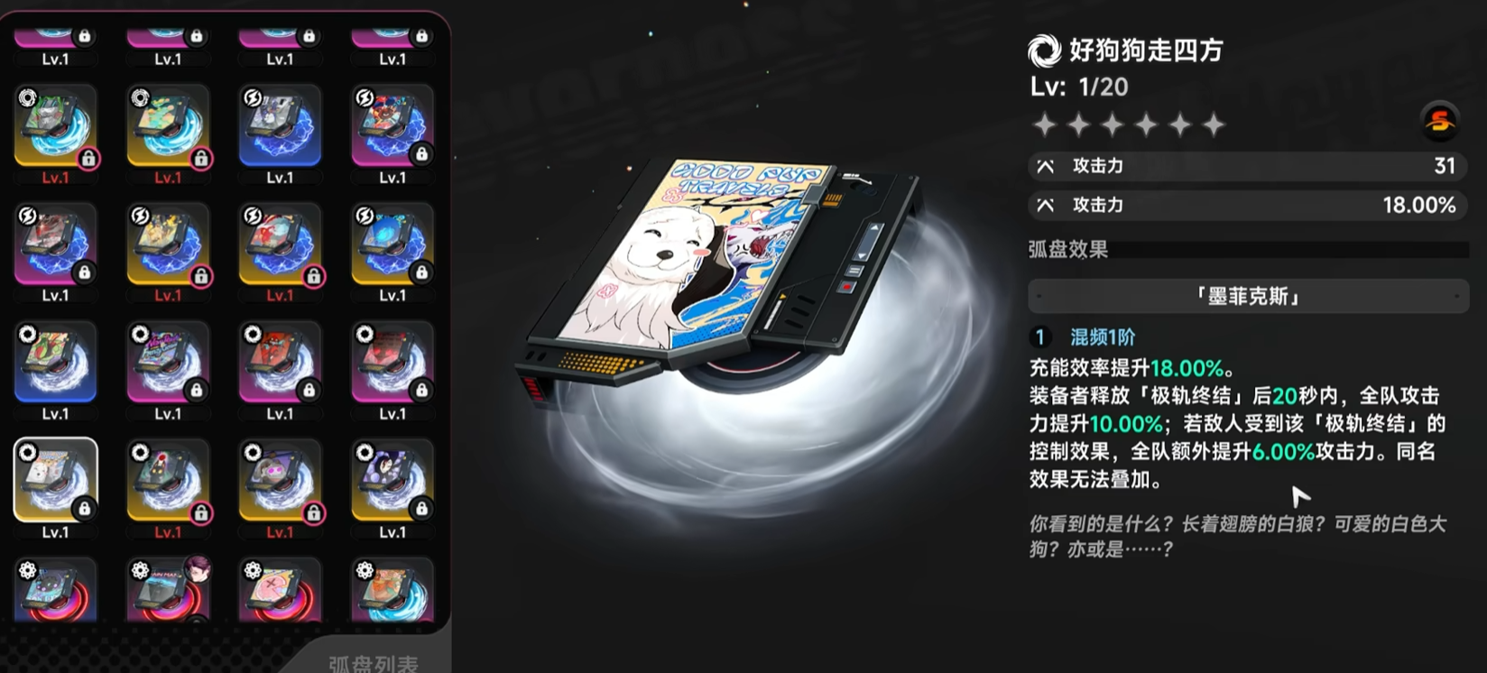 好狗狗走四方弧盘则聚焦团队协同增益,属于副本攻坚关键配置。当装备者成功释放“极轨终结”后,全队将在20秒内获得10%攻击力提升;与此同时,敌方所有攻击行为均会额外触发一次基于全队攻击力的附加伤害。该效果与具备强制控制能力的角色(如缄默、艾琳)高度契合,可通过稳定控场维持增益持续覆盖,显著拉升整支队伍的瞬间爆发阈值。