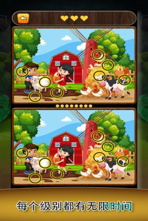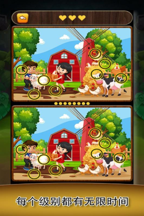 采用沉浸式闯关机制,每关提供两张构图一致但存在5处差异的高清图像,涵盖森林秘境、古堡遗迹、海底奇观等多样化背景。界面采用极简交互逻辑,无干扰元素,辅以双倍局部放大镜与暂停功能,降低入门门槛。差异类型包含色彩饱和度偏移、物件数量增减、纹理方向变化等,强调系统性观察方法而非单纯依赖运气,利于培养结构化信息处理习惯。