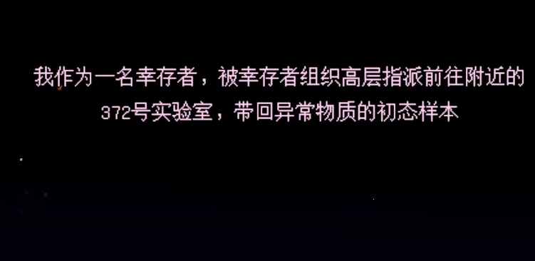 游戏开场以多段精炼文本切入,快速建立世界观背景:一场未知灾变后,人类文明几近崩解。玩家扮演唯一受控幸存者,任务目标明确——潜入编号为“372”的地下实验室,取回关键生物样本。整段实验室流程兼具叙事引导与操作教学功能,涵盖移动、拾取、交互、基础战斗等核心机制,帮助新玩家平滑上手。