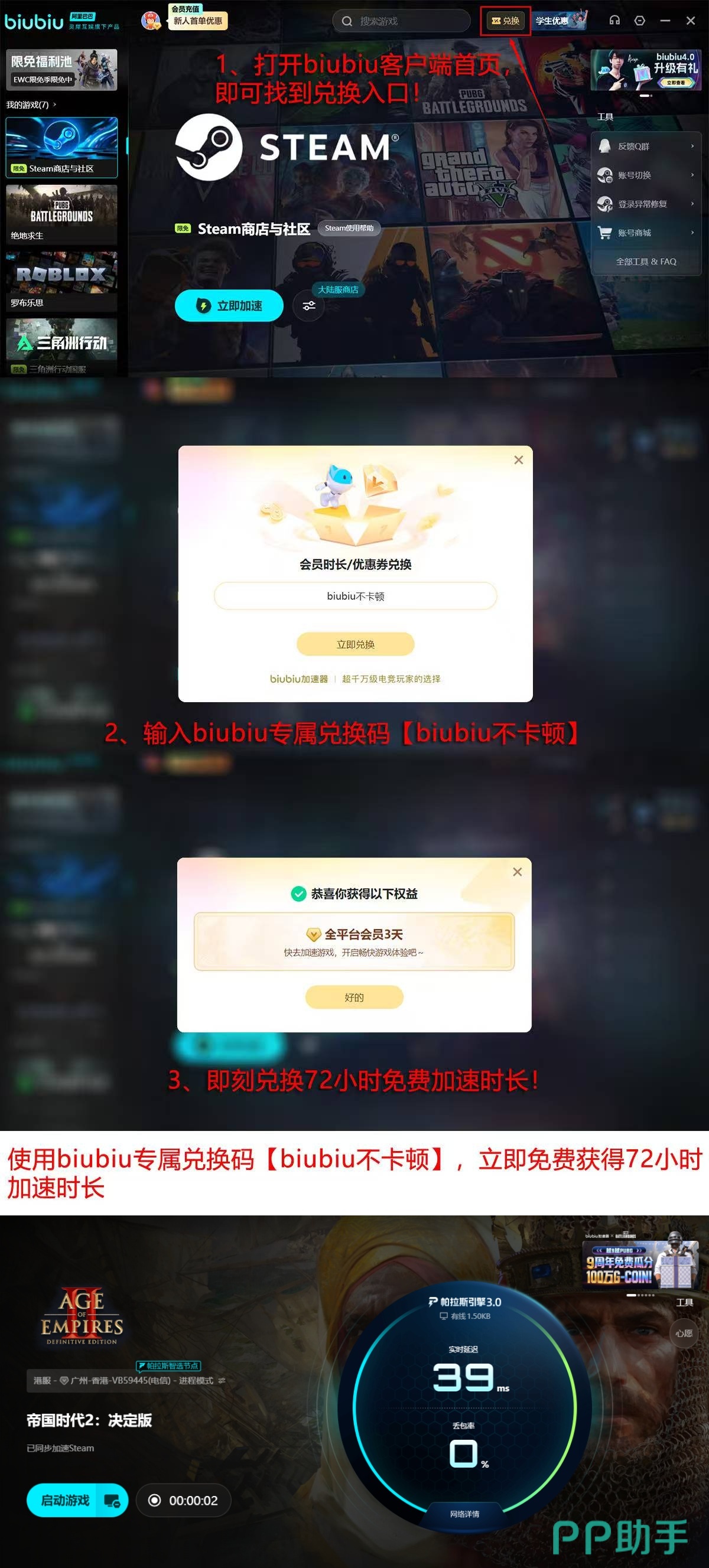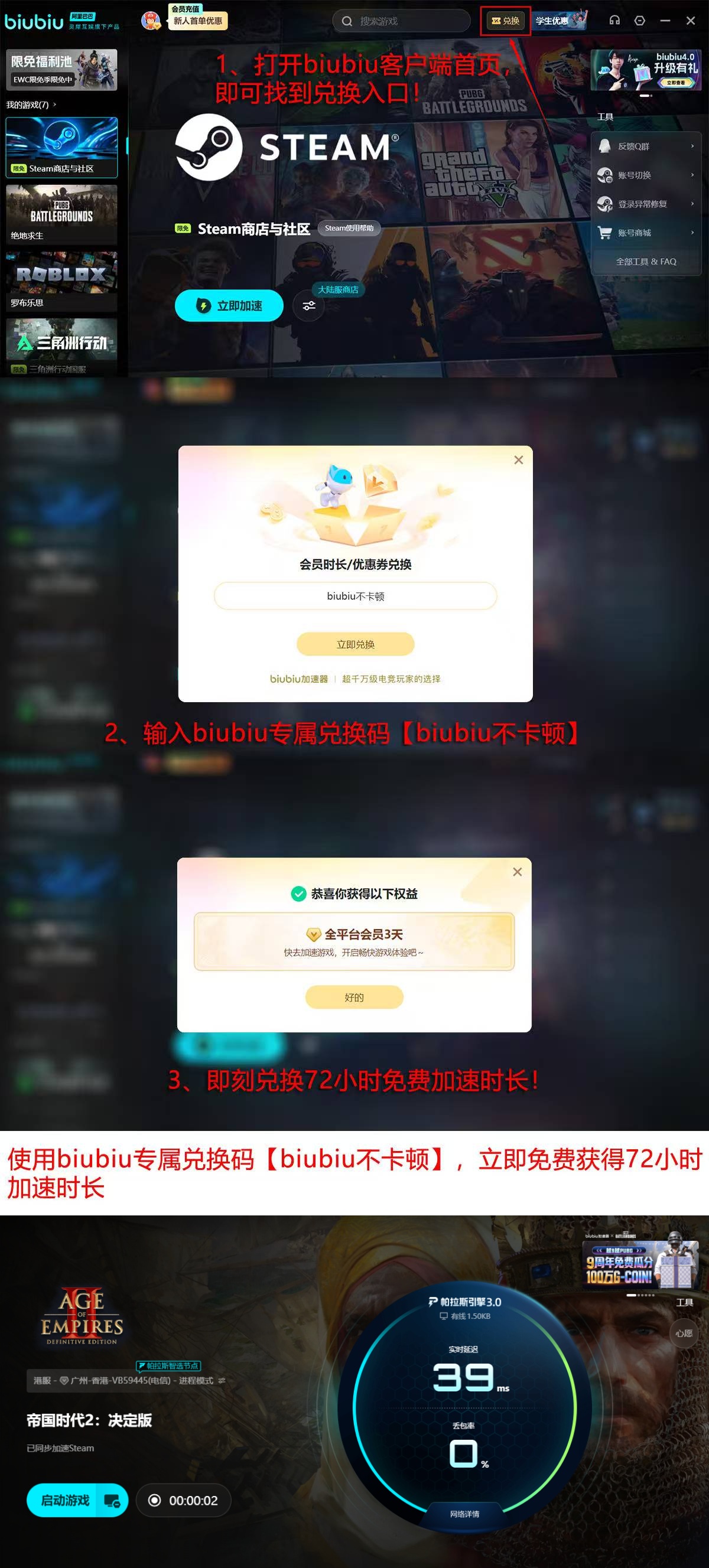 新用户注册即可获得24小时全功能免费试用权限。所有用户——无论首次安装或回归使用——打开客户端后,在兑换窗口准确输入专属口令【biubiu不卡顿】,即可额外领取72小时加速时长。两项权益叠加后,总计可享96小时无限制加速服务,无需付费、无需绑定支付方式。