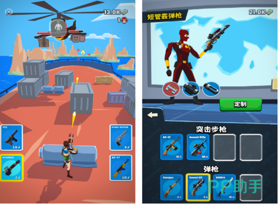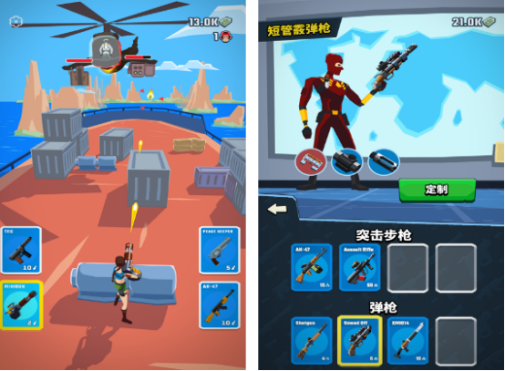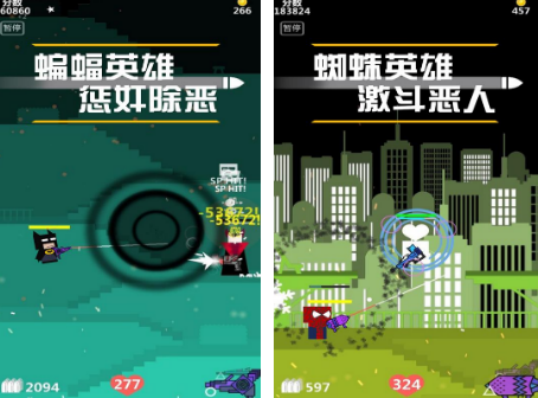 一款创意十足的休闲射击游戏,角色设定融合超级英雄元素,如蜘蛛英雄、蝙蝠英雄等。玩家通过百种武器与配件组合提升战力,每发子弹命中均有炫彩特效呈现。初始仅配备基础枪械,后续可通过击败小兵或Boss逐步获取更强装备,强化成长路径清晰。