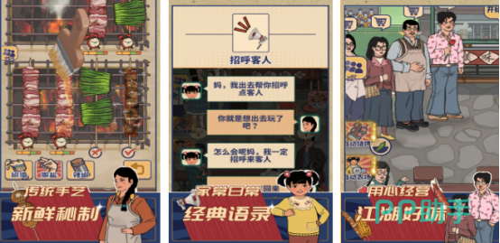 采用经典怀旧美术风格,高度复刻上世纪80至90年代街边烧烤摊的视觉氛围。场景细节考究,从铁架炭炉到搪瓷盘、老式风扇、霓虹灯牌均细致呈现。食材涵盖十余种肉串与素串,全部采用传统工艺逻辑设计:需根据肉类厚度调节翻面频率,依据顾客偏好选择孜然、辣椒面或秘制酱汁,真实还原烟火气十足的市井烧烤文化。