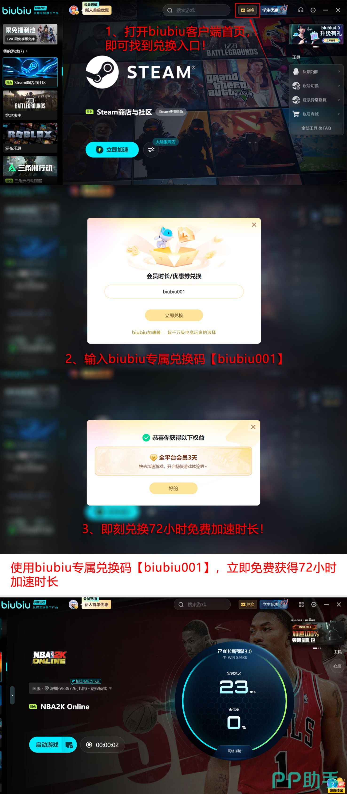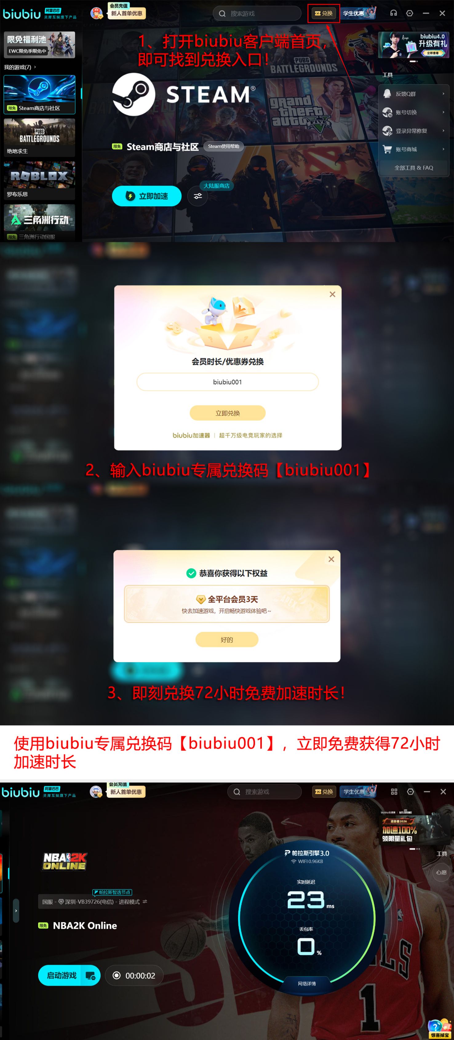 为降低用户尝试门槛,该工具提供零成本初体验机制:新注册账号完成激活后,系统即刻发放24小时全功能加速时长;使用完毕后,输入激活码【biubiu001】可额外领取72小时权益,累计达96小时免费使用周期,覆盖完整测试与深度体验阶段。
