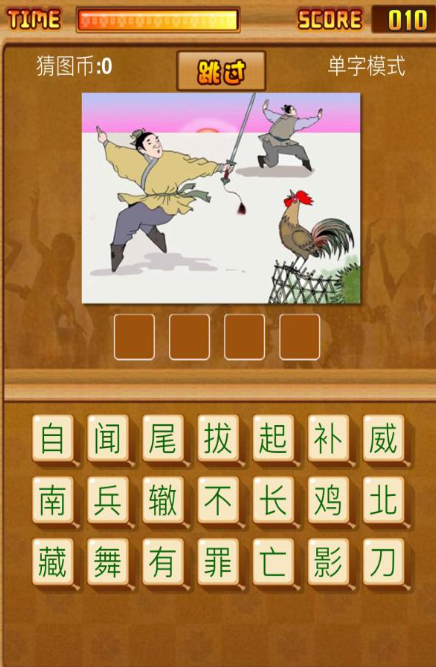 该作将传统文化与视觉解谜深度融合。游戏提供两种答题路径:其一为“拆字组合”模式,系统随机呈现多个单字,玩家需从中挑选并排列成符合画面寓意的四字成语;其二为“选项识别”模式,在若干完整成语中精准匹配图片所隐喻的经典典故或抽象概念。题图设计直观生动,兼顾认知引导与思维拓展。