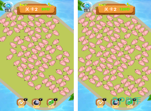 以方向对齐为核心机制的益智小游戏,主角为多角度旋转的粉色小猪。玩家需在倒计时内调整各小猪朝向,使其全部统一朝向指定方向以完成通关。内置加时、撤销、反向等辅助道具,降低挫败感,强化正向反馈循环,适合碎片化时间放松使用。