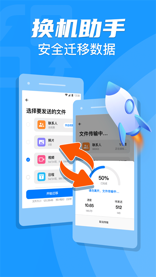 别看名字短,这款软件的内核是“轻量极速”。安装包只有不到10兆,占用内存极小,非常适合那些老手机剩余空间已经很紧张的情况。小编在只有1G剩余存储的旧手机上装它,运行起来一点不卡。它的传输逻辑是“先传关键数据,后传大文件”——系统会先把通讯录、短信、设置选项这些几秒钟就能搞定的小数据传完,让新手机先能正常用起来,然后在后台慢慢搬照片和视频。适用场景是旧手机已经卡得不行、只想赶紧把重要数据抢救出来的用户。