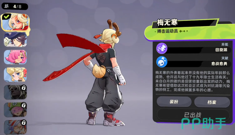 新手入门阶段推荐优先培养梅无寒。该角色以银白发色与鹿角装饰构成视觉记忆点,在设定中为隐世修行者,核心异能为高机动性回旋踢,具备短CD位移与稳定硬直打断效果。在缺乏载具支援的前期关卡中,其技能组合可高效应对近身突袭型敌人,操作容错率高,资源投入产出比突出,是零氪或轻度玩家过渡主线前中期的理想选择。
