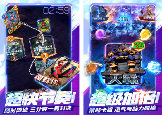 由漫威正版授权的创新型卡牌对战游戏,曾获多项国际移动游戏大奖,全球累计下载量持续攀升。采用三分钟一局的快节奏对战模式,支持跨服匹配。游戏内涵盖钢铁侠、蜘蛛侠、雷神等数百位漫威英雄变体,通过收集与升级变体卡牌,构建差异化战术体系,实现战局中的关键性逆转。