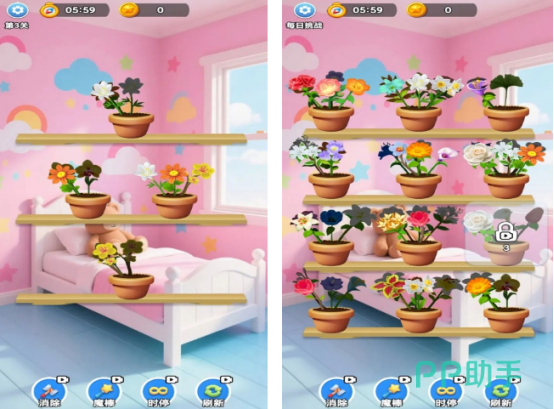采用经典三消规则构建花艺世界。每个花盆即为独立消除场景,玩家通过滑动调整花朵位置,达成横向或纵向三个及以上同色花朵连消即可完成目标。界面配色明快,花朵建模细腻,辅以道具系统提升策略深度,整体操作门槛低、沉浸感强。