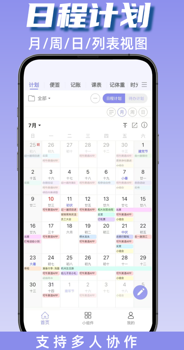 兼顾个人、家庭与团队协作的日程管理工具。除基础日历视图外,集成待办事项、轻量笔记、收支记录、课表管理、健康打卡及体重追踪等十余类功能模块,避免用户在多个应用间频繁切换。支持自定义分类标签、灵活设置重复规则(如每周二四六、每月第3个工作日),并提供多级提醒机制保障执行到位。核心优势在于多人协同能力:家庭成员可共享日程安排,团队成员能同步工作任务进度,记账与打卡行为亦支持邀请同伴共同参与,增强执行约束力与完成动力。