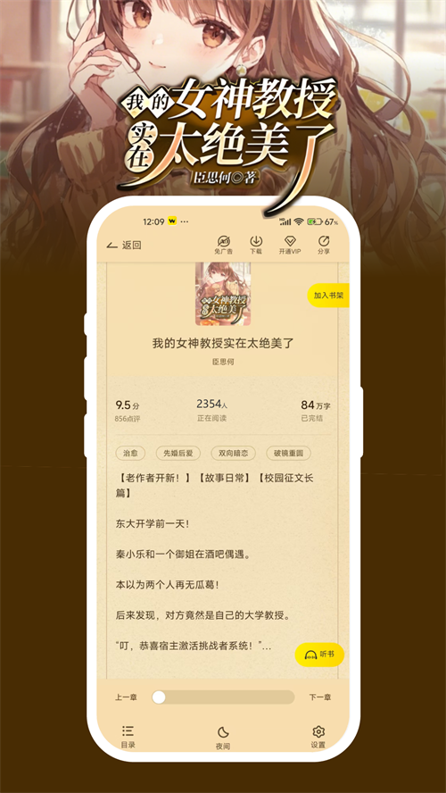 全站所有小说都是免费的,不用开会员就能通读整本。AI个性化推荐系统特别好用,会根据阅读习惯推一些意料之外的好书,经常能发现惊喜。看小说还能赚零花钱,福利这块做得挺良心。听书功能也是一键就能转音频,完全不需要额外付费,躺着听书的感觉实在太惬意了。