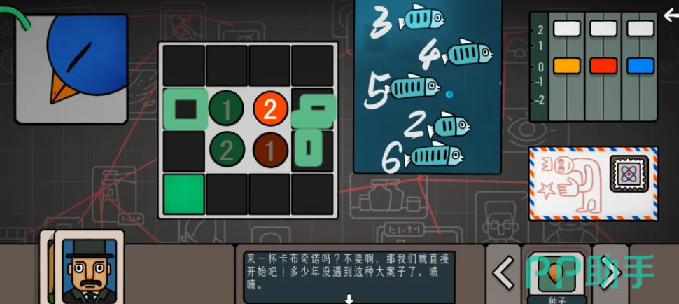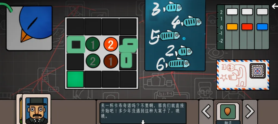 进入游戏之后,玩家就会得到一些基本的物品,即种子、邮票、杀虫剂等。简单的互动之后就可以开始贴邮票并打开信封中的秘密。最初的使命看上去很简单,但是它为以后更复杂的谜题埋下了伏笔。随着不断地解锁,就会进入各种各样的解谜场景,遇到越来越复杂的任务。用五个旋转的轮子来获得剪刀、种子。接着就进入了更加精彩的游戏中,解锁更多的人物卡以及其它重要的信息。