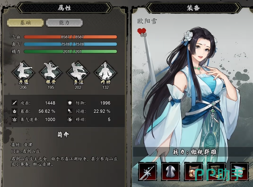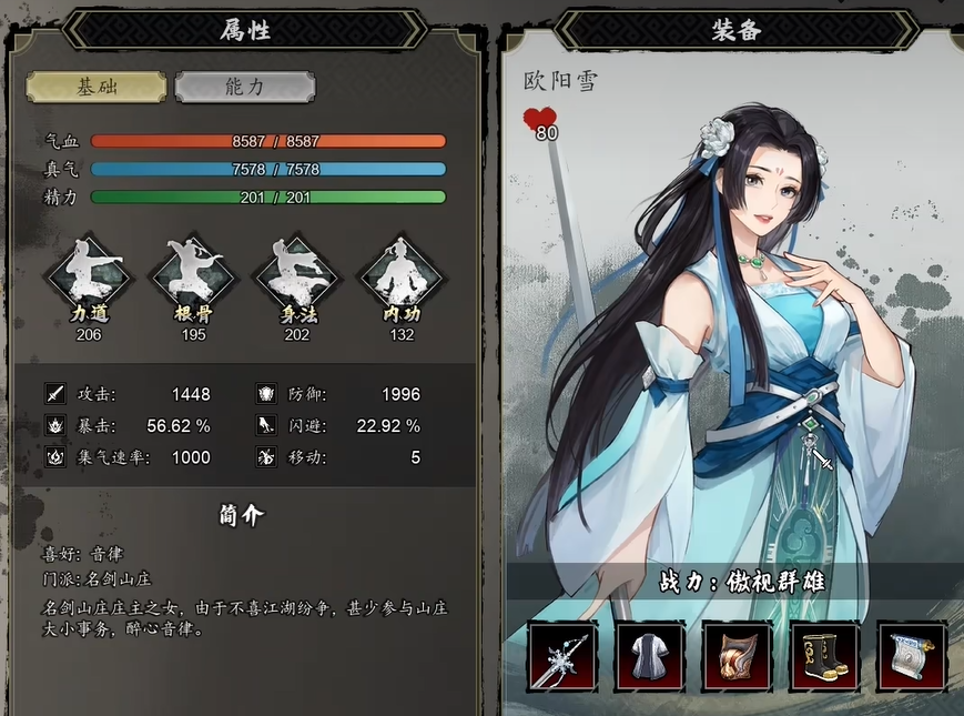 欧阳雪这个角色现在版本里定位比较偏辅助,暂时不太适合用混沌武典。但是听说后续版本可能会有更新,如果她能解锁冰心诀之类的技能,说不定也能走异常流派,到时候可以再考虑。